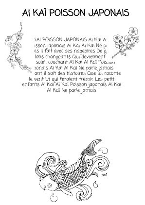 AI KAI POISSON JAPONAIS Aï Kaï Aï Kaï Poisson japonais Aï Kaï Aï Kaï Ne parle jamais Il fait avec ses nageoires De grands papillons changeants Qui deviennent roses Au soleil couchant Aï Kaï Aï Kaï Poisson japonais Aï Kaï Aï Kaï Ne parle jamais Pourtant il sait des histoires Que lui raconte le vent Et qui feraient frémir Les petit enfants Aï Kaï Aï Kaï Poisson japonais Aï Kaï Aï Kaï Ne parle jamais