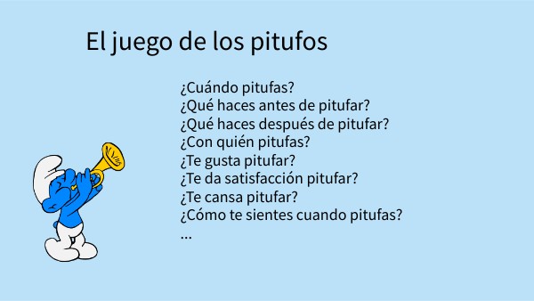 ¿Cuándo pitufas? ¿Qué haces antes de pitufar? ¿Qué haces después de pitufar? ¿Con quién pitufas? ¿Te gusta pitufar? ¿Te da satisfacción pitufar? ¿Te cansa pitufar? ¿Cómo te sientes cuando pitufas? ...