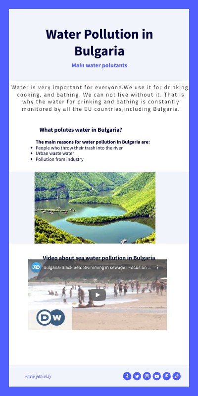 Water is very important for everyone.We use it for drinking, cooking, and bathing. We can not live without it. That is why the water for drinking and bathing is constantly monitored by all the EU countries,including Bulgaria.