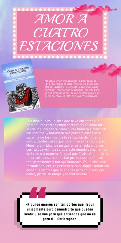 Es un libro que recomiendo leer, es perfecto para cualquier momento en el que sientas que te ahogas pero no lo leas por deber, pierde su magia y el sentimiento.