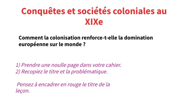 a) DÉCRIRE la colonisation par les Européens au XIXème siècle et utilisant des repères et du vocabulaire précis : régions colonisées, acteurs de la colonisation, motivations, moyens de la colonisation