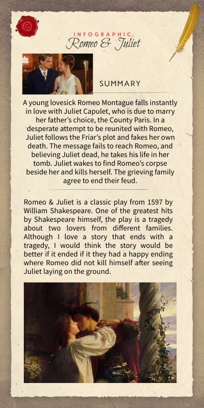 Romeo & Juliet is a classic play from 1597 by William Shakespeare. One of the greatest hits by Shakespeare himself, the play is a tragedy about two lovers from different families. Although I love a story that ends with a tragedy, I would think the story would be better if it ended if it they had a happy ending where Romeo did not kill himself after seeing Juliet laying on the ground.