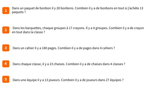 Dans un paquet de bonbon il y a 28 bonbons. Combien il y a de bonbons en tout si j’achète 13 paquets ? Dans les barquettes, chaque groupe à 17 crayons. Il y a 4 groupes. Combien il y a de crayon en tout dans la classe ? Dans un cahier il y a 180 pages. Combien il y a de pages dans 4 cahiers ? Dans chaque classe, il y a 23 chaises. Combien il y a de chaises dans 4 classes ? Dans une équipe il y a 13 joueurs. Combien il y a de joueurs dans 27 équipes ?