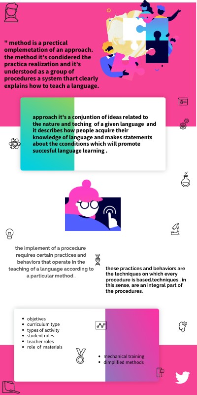 " method is a prectical omplemetation of an approach. the method it's condidered the practica realization and it's understood as a group of procedures a system thart clearly explains how to teach a language.