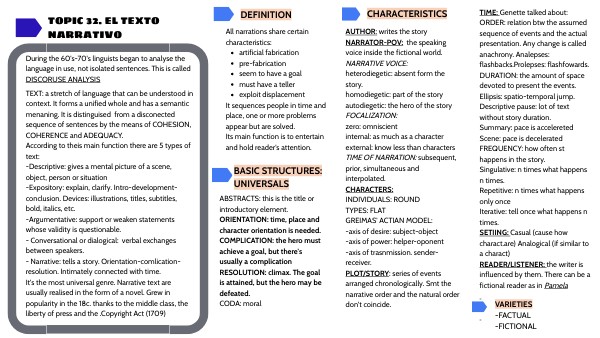 AUTHOR: writes the story NARRATOR-POV: the speaking voice inside the fictional world. NARRATIVE VOICE: heterodiegetic: absent form the story. homodiegetic: part of the story autodiegetic: the hero of the story FOCALIZATION: zero: omniscient internal: as much as a character external: know less than characters TIME OF NARRATION: subsequent, prior, simultaneous and interpolated. CHARACTERS: INDIVIDUALS: ROUND TYPES: FLAT GREIMAS' ACTIAN MODEL: -axis of desire: subject-object -axis of power: helper-oponent -axis of trasnmission. sender-receiver. PLOT/STORY: series of events arranged chronologically. Smt the narrative order and the natural order don't coincide.