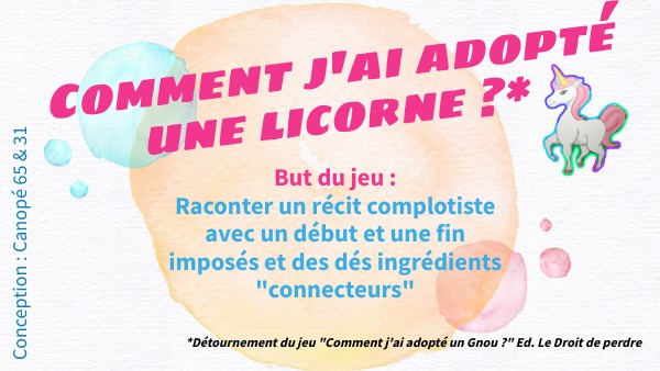 But du jeu : Raconter un récit complotiste avec un début et une fin imposés et des dés ingrédients "connecteurs"