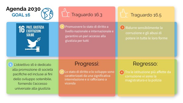 L'obiettivo 16 è dedicato alla promozione di società pacifiche ed incluse ai fini dello sviluppo sotenibile, fornendo l'accesso universale alla giustizia