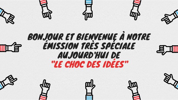 BONJOUR ET BIENVENUE À NOTRE ÉMISSION TRÈS SPÉCIALE AUJOURD'HUI DE "LE CHOC DES IDÉES"