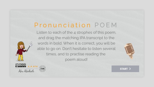 Listen to each of the 4 strophes of this poem, and drag the matching IPA transcript to the words in bold. When it is correct, you will be able to go on. Don't hesitate to listen several times, and to practise reading the poem aloud!