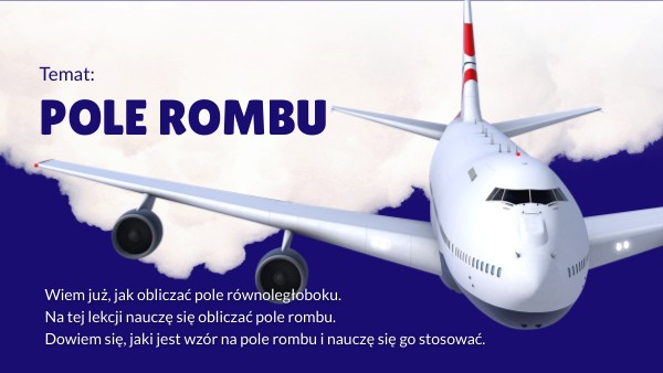 Wiem już, jak obliczać pole równoległoboku.Na tej lekcji nauczę się obliczać pole rombu. Dowiem się, jaki jest wzór na pole rombu i nauczę się go stosować.