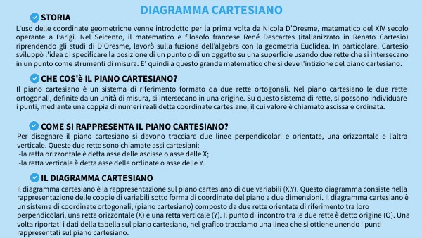 Il diagramma cartesiano è la rappresentazione sul piano cartesiano di due variabili (X,Y). Questo diagramma consiste nella rappresentazione delle coppie di variabili sotto forma di coordinate del piano a due dimensioni. Il diagramma cartesiano è un sistema di coordinate ortogonali, (piano cartesiano) composto da due rette orientate di riferimento tra loro perpendicolari, una retta orizzontale (X) e una retta verticale (Y). Il punto di incontro tra le due rette è detto origine (O). Una volta riportati i dati della tabella sul piano cartesiano, nel grafico tracciamo una linea che si ottiene unendo i punti rappresentati sul piano cartesiano.