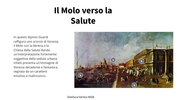 In questo dipinto Guardi raffigura uno scorcio di Venezia, il Molo con la libreria e la Chiesa della Salute dando un'interpretazione fortemente soggettiva della veduta urbana. Infatti presenta un'immagine di Venezia decadente e fantastica, segnata da un carattere emotivo e malinconico.