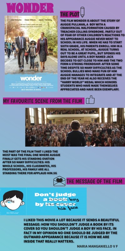 The part of the film that I liked the most was the final one where Auggie finally gets his standing ovation after so many difficulties: his whole school, his classmates, his professors, his family are all standing there for applaud him.5g