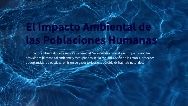 El impacto ambiental puede ser local o mundial. Se entiende como el efecto que causan las actividades humanas al ambiente y estas pueden ser la contaminación de los mares, desechos de sustancias radioactivas, emisión de gases tóxicos o la pérdida de hábitats naturales.