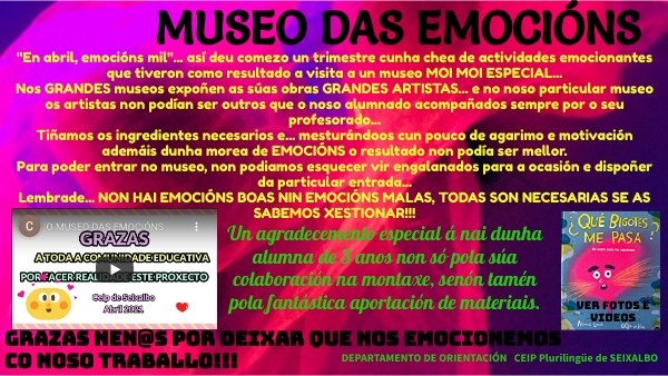"En abril, emocións mil"... así deu comezo un trimestre cunha chea de actividades emocionantes que tiveron como resultado a visita a un museo MOI MOI ESPECIAL... Nos GRANDES museos expoñen as súas obras GRANDES ARTISTAS... e no noso particular museo os artistas non podían ser outros que o noso alumnado acompañados sempre por o seu profesorado... Tiñamos os ingredientes necesarios e... mesturándoos cun pouco de agarimo e motivación ademáis dunha morea de EMOCIÓNS o resultado non podía ser mellor. Para poder entrar no museo, non podiamos esquecer vir engalanados para a ocasión e dispoñer da particular entrada... Lembrade... NON HAI EMOCIÓNS BOAS NIN EMOCIÓNS MALAS, TODAS SON NECESARIAS SE AS SABEMOS XESTIONAR!!!
