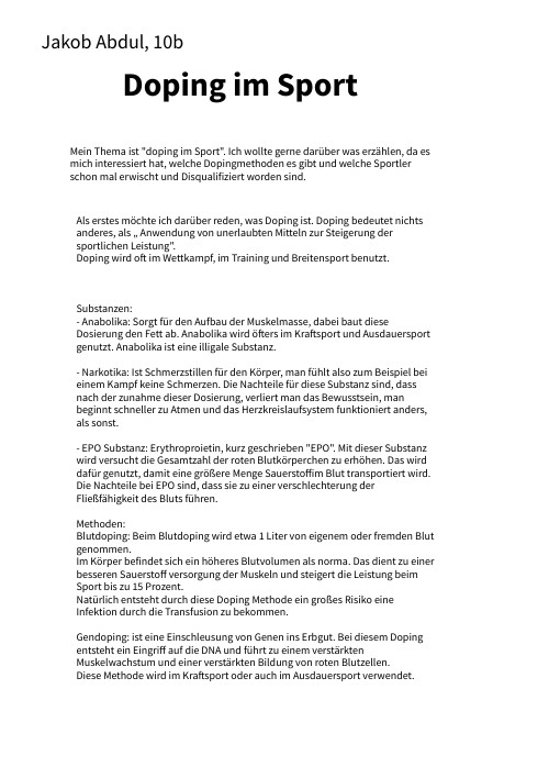 Als erstes möchte ich darüber reden, was Doping ist. Doping bedeutet nichts anderes, als „ Anwendung von unerlaubten Mitteln zur Steigerung der sportlichen Leistung".Doping wird oft im Wettkampf, im Training und Breitensport benutzt. Substanzen: - Anabolika: Sorgt für den Aufbau der Muskelmasse, dabei baut diese Dosierung den Fett ab. Anabolika wird öfters im Kraftsport und Ausdauersport genutzt. Anabolika ist eine illigale Substanz. - Narkotika: Ist Schmerzstillen für den Körper, man fühlt also zum Beispiel bei einem Kampf keine Schmerzen. Die Nachteile für diese Substanz sind, dass nach der zunahme dieser Dosierung, verliert man das Bewusstsein, man beginnt schneller zu Atmen und das Herzkreislaufsystem funktioniert anders, als sonst. - EPO Substanz: Erythroproietin, kurz geschrieben "EPO". Mit dieser Substanz wird versucht die Gesamtzahl der roten Blutkörperchen zu erhöhen. Das wird dafür genutzt, damit eine größere Menge Sauerstoffim Blut transportiert wird. Die Nachteile bei EPO sind, dass sie zu einer verschlechterung der Fließfähigkeit des Bluts führen. Methoden: Blutdoping: Beim Blutdoping wird etwa 1 Liter von eigenem oder fremden Blut genommen. Im Körper befindet sich ein höheres Blutvolumen als norma. Das dient zu einer besseren Sauerstoff versorgung der Muskeln und steigert die Leistung beim Sport bis zu 15 Prozent. Natürlich entsteht durch diese Doping Methode ein großes Risiko eine Infektion durch die Transfusion zu bekommen. Gendoping: ist eine Einschleusung von Genen ins Erbgut. Bei diesem Doping entsteht ein Eingriff auf die DNA und führt zu einem verstärkten Muskelwachstum und einer verstärkten Bildung von roten Blutzellen. Diese Methode wird im Kraftsport oder auch im Ausdauersport verwendet.