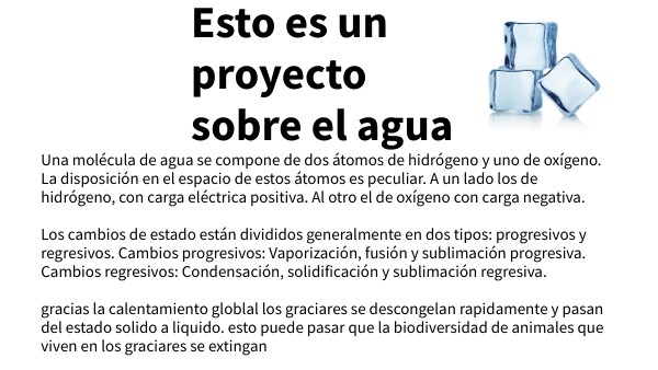 Una molécula de agua se compone de dos átomos de hidrógeno y uno de oxígeno. La disposición en el espacio de estos átomos es peculiar. A un lado los de hidrógeno, con carga eléctrica positiva. Al otro el de oxígeno con carga negativa. Los cambios de estado están divididos generalmente en dos tipos: progresivos y regresivos. Cambios progresivos: Vaporización, fusión y sublimación progresiva. Cambios regresivos: Condensación, solidificación y sublimación regresiva. gracias la calentamiento globlal los graciares se descongelan rapidamente y pasan del estado solido a liquido. esto puede pasar que la biodiversidad de animales que viven en los graciares se extingan
