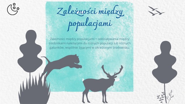 Zależności między populacjami = oddziaływania między osobnikami należącymi do różnych populacji lub różnych gatunków, wspólnie żyjącymi w określonym środowisku.
