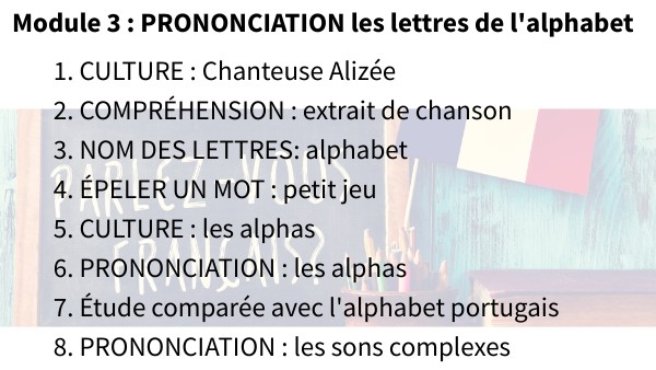 1. CULTURE : Chanteuse Alizée 2. COMPRÉHENSION : extrait de chanson 3. NOM DES LETTRES: alphabet 4. ÉPELER UN MOT : petit jeu 5. CULTURE : les alphas 6. PRONONCIATION : les alphas 7. Étude comparée avec l'alphabet portugais 8. PRONONCIATION : les sons complexes