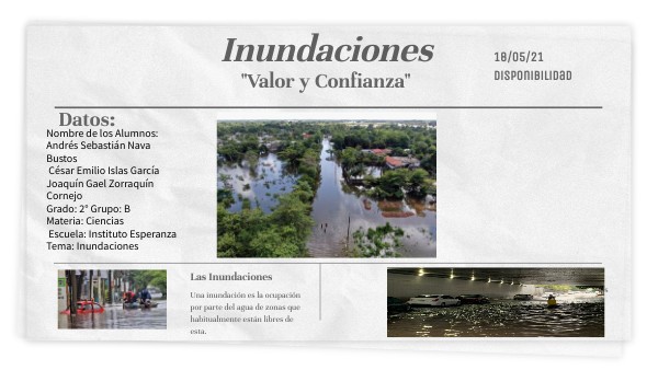 Nombre de los Alumnos: Andrés Sebastián Nava Bustos César Emilio Islas García Joaquín Gael Zorraquín Cornejo Grado: 2° Grupo: B Materia: Ciencias Escuela: Instituto Esperanza Tema: Inundaciones