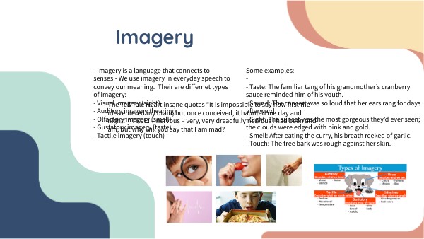 - Imagery is a language that connects to senses.- We use imagery in everyday speech to convey our meaning. Their are differnet types of imagery:- Visual imagery (sight) - Auditory imagery (hearing) - Olfactory imagery (smell) - Gustatory imagery (taste) - Tactile imagery (touch)