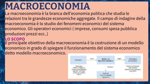La macroeconomia è la branca dell'economia politica che studia le relazioni tra le grandezze economiche aggregate. Il campo di indagine della macroeconomia è lo studio dei fenomeni economici del sistema economico. Gli operatori economici ( imprese, consumi spesa pubblica produzioni prezzi ecc..)