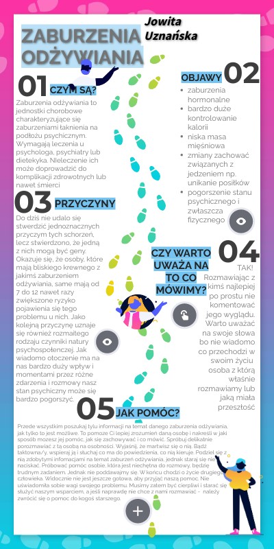 Przede wszystkim poszukaj tylu informacji na temat danego zaburzenia odżywiania, jak tylko to jest możliwe. To pomoze Ci lepiej zrozumień daną osobę i nakreśli w jaki sposób mozesz jej pomóc, jak się zachowywać i co mówić. Spróbuj delikatnie porozmawiać z tą osobą na osobności. Wyjaśnij, że martwisz się o nią. Bądź taktowna/y, wspieraj ją i słuchaj co ma do powiedzienia, co nią kieruje. Podziel się z nią zdobytymi infomacjami na temat zaburzeń odżywiania, jednak staraj się nie naciskać. Próbować pomóc osobie, która jest niechętna do rozmowy, będzię trudnym zadaniem. Jednak nie poddawajmy się. W końcu chodzi o życie drugiego człowieka. Widocznie nie jest jeszcze gotowa, aby przyjąć naszą pomoc. Nie uświadomiła sobie wagi swojego problemu. Musimy zatem być cierpliwi i starać się służyć naszym wsparciem, a jeśli naprawdę nie chce z nami rozmawiać - należy zwrócić się o pomoc do kogoś starszego.
