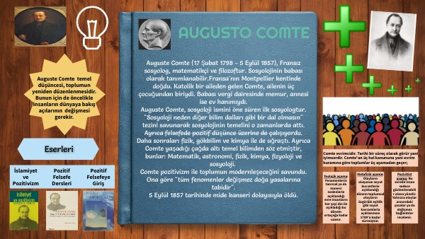 Auguste Comte temel düşüncesi, toplumun yeniden düzenlenmesidir. Bunun için de öncelikle insanların dünyaya bakış açılarının değişmesi gerekir.