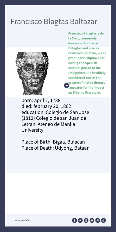Francisco Balagtas y de la Cruz, commonly known as Francisco Balagtas and also as Francisco Baltazar, was a prominent Filipino poet during the Spanish colonial period of the Philippines. He is widely considered one of the greatest Filipino literary laureates for his impact on Filipino literature.