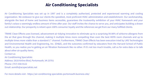Air Conditioning Specialists was set up in 1997 and is a completely authorized, protected and experienced warming and cooling organization. We endeavor to give our clients the speediest, most proficient HVAC administration and establishment. Our workmanship, alongside the best of home and business items accessible, guarantees the trustworthy exhibition of your HVAC framework and your family's solace a seemingly endless amount of time after year. Our staff invites the chance to serve you, and anticipates building a drawn out relationship. Our prosperity is reliant upon 100% consumer loyalty and the references we get from our many fulfilled clients. TRANE Clean Effects uses licensed, advancement air tidying innovation to eliminate up to a surprising 99.98% of airborne allergens from the air that goes through the channel, making it multiple times more compelling than even the best HEPA room channels and up to multiple times more viable than a standard 1″ channel. Furthermore, TRANE Clean Effects has been execution tried by LMS Technologies and Environmental Health and Engineering, Inc. (EH&E), and the outcomes confirmed by educators from the Harvard School of Public Health, so you realize you're getting an air filtration framework like no other. If it's not too much trouble, call us for extra data or to talk about other air quality items. Contact us Air Conditioning Specialists Address: 2618 Airline Blvd, Portsmouth, VA 23701 Phone: (757) 558-9122 Email: asmith@acspecialists.net For more details visit - https://air-conditioning-specialists-portsmouth.business.site/