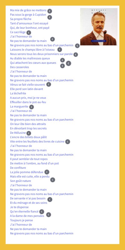 Ma mie de grâce ne mettons Pas sous la gorge à Cupidon Sa propre flèche Tant d'amoureux l'ont essayé Qui, de leur bonheur, ont payé Ce sacrilège J'ai l'honneur de Ne pas te demander ta main Ne gravons pas nos noms au bas d'un parchemin Laissons le champs libre à l'oiseau Nous serons tous les deux prisonniers sur parole Au diable les maîtresses queux Qui attachent les cœurs aux queues Des casseroles J'ai l'honneur de Ne pas te demander ta main Ne gravons pas nos noms au bas d'un parchemin Vénus se fait vielle souvent Elle perd son latin devant La lèchefrite A aucun prix, moi je ne veux Effeuiller dans le pot-au-feu La marguerite J'ai l'honneur de Ne pas te demander ta main Ne gravons pas nos noms au bas d'un parchemin On leur ôte bien des attraits En dévoilant trop les secrets De Mélusine L'encre des billets doux pâlit Vite entre les feuillets des livres de cuisine J'ai l'honneur de Ne pas te demander ta main Ne gravons pas nos noms au bas d'un parchemin Il peut sembler de tout repos De mettre à l'ombre, au fond d'un pot De confiture La jolie pomme défendue Mais elle est cuite, elle a perdu Son goût nature J'ai l'honneur de Ne pas te demander ta main Ne gravons pas nos noms au bas d'un parchemin De servante n'ai pas besoin Et du ménage et de ses soins Je te dispense Qu'en éternelle fiancé A la dame de mes pensées Toujours je pense J'ai l'honneur de Ne pas te demander ta main Ne gravons pas nos noms au bas d'un parchemin