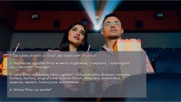 1. Czy lubisz chodzić do kina? Jak często tam chodzisz? 2. Najchętniej oglądasz filmy w wersji oryginalnej, z napisami, z dubbingiem czy z lektorem? Dlaczego? 3. Jakie filmy najbardziej lubisz oglądać? (dokumentalne, dramaty, komedie, thrillery, horrory, biograficzne, science-fiction, filmy akcji, kryminalne, wojenne, western, historyczne, animowane) 4. Wolisz filmy czy seriale?