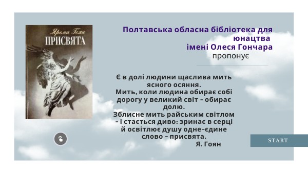 Є в долі людини щаслива мить ясного осяння.Мить, коли людина обирає собі дорогу у великий світ - обирає долю. Зблисне мить райським світлом - і стається диво: зринає в серці й освітлює душу одне-єдине слово - присвята. Я. Гоян