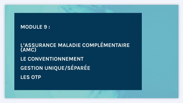 Module 9 : L’Assurance Maladie Complémentaire (AMC) Le conventionnement Gestion unique/séparée Les OTP