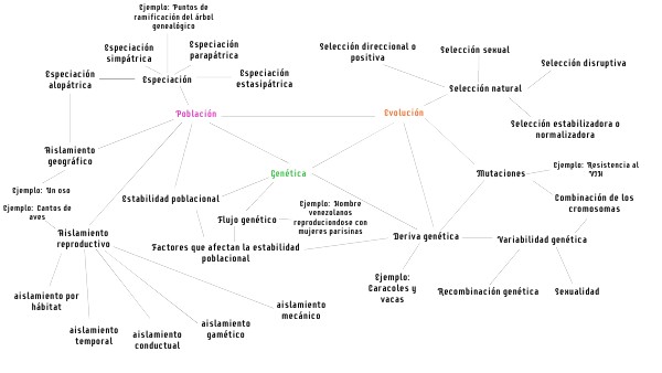 Población: Ecured (2014) Genética de poblaciones. (Página en línea) [fecha de consulta 5 de mayo de 2021] Disponible en: https://www.ecured.cu/Gen%C3%A9tica_de_poblaciones#Concepto_de_poblaci.C3.B3n Genética: Anna C. Edens Hurst, David Zieve (2020) Genética. (Página en línea) [fecha de consulta 5 de mayo de 2021] Disponible en: https://medlineplus.gov/spanish/ency/article/002048.htm#:~:text=La%20gen%C3%A9tica%20es%20el%20estudio,est%C3%A1%20determinada%20por%20los%20genes. Evolución: Significados.com (2019) Evolución. (Página en línea) [fecha de consulta 5 de mayo de 2021] Disponible en: https://www.significados.com/evolucion/#:~:text=La%20evoluci%C3%B3n%20es%20el%20cambio,un%20proceso%20de%20transformaci%C3%B3n%20progresiva.&text=Por%20lo%20tanto%2C%20son%20comunes,cient%C3%ADfica%2C%20evoluci%C3%B3n%20econ%C3%B3mica%2C%20etc. Estabilidad poblacional y factores: Monografias.com (S.f) Factores que afectan la estabilidad de las poblaciones. (Página en línea) [fecha de consulta 5 de mayo de 2021] Disponible en: https://www.monografias.com/docs/Factores-que-afectan-la-estabilidad-de-las-F3THXGFJDG2Y Deriva genética: - NIH (S.f) Deriva genética. (Página en línea) [fecha de consulta 5 de mayo de 2021] Disponible en: https://www.genome.gov/es/genetics-glossary/Deriva-genetica - Gelambi, Mariana (2020) Deriva genética causas, efectos, ejemplos. (Página en línea) [fecha de consulta 5 de mayo de 2021] Disponible en: https://www.lifeder.com/deriva-genetica/ Flujo genético: Belmonte, Angela (2019) Flujo de genes: definición y ejemplos. (Página en línea) [fecha de consulta 5 de mayo de 2021] Disponible en: https://www.unprofesor.com/ciencias-naturales/flujo-de-genes-definicion-y-ejemplos-3463.html Mutaciones: María Estela Raffino (2021) Mutación. (Página en línea) [fecha de consulta 5 de mayo de 2021] Disponible en: https://concepto.de/mutacion/#:~:text=En%20gen%C3%A9tica%20se%20llama%20mutaci%C3%B3n,ser%20heredados%20a%20sus%20descendientes. Selección natural: María Estela Raffino (2021) Selección natural. (Página en línea) [fecha de consulta 5 de mayo de 2021] Disponible en: https://concepto.de/seleccion-natural/ Variabilidad genética: Enciclopedia de ejemplos (2019) Ejemplos de variabilidad genética. (Página en línea) [fecha de consulta 5 de mayo de 2021] Disponible en: https://www.ejemplos.co/ejemplos-de-variabilidad-genetica/ Especiación: - Spanish Society of Evolutionary Biology (S.f) Definición de especiación. (Página en línea) [fecha de consulta 5 de mayo de 2021] Disponible en: https://evolution.berkeley.edu/evolibrary/article/0_0_0/evo_42_sp - Yanez, Daisy (2020) Los 4 tipos de especiación más importantes con ejemplos (Pagina en línea) [fecha de consulta 5 de mayo de 2021] Disponible en: https://www.lifeder.com/tipos-de-especiacion/ Aislamiento geográfico: Google Arts and Culture (S.f) Aislamiento geográfico. (Página en línea) [fecha de consulta 5 de mayo de 2021] Disponible en: https://artsandculture.google.com/entity/g11bxc61h_d Aislamiento reproductivo: Khan Academy (S.f) Especies y especiación. (Página en línea) [fecha de consulta 5 de mayo de 2021] Disponible en: https://es.khanacademy.org/science/ap-biology/natural-selection/speciation/a/species-speciation