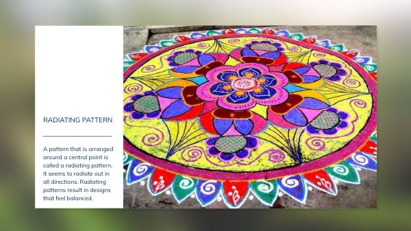 A pattern that is arranged around a central point is called a radiating pattern. It seems to radiate out in all directions. Radiating patterns result in designs that feel balanced.