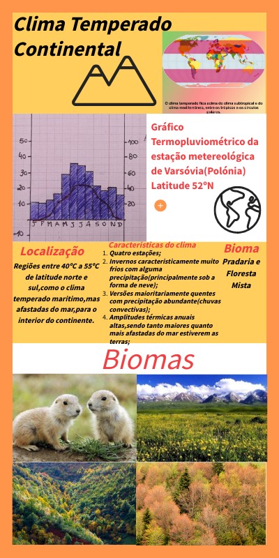 Regiões entre 40ºC a 55ºC de latitude norte e sul,como o clima temperado maritimo,mas afastadas do mar,para o interior do continente.