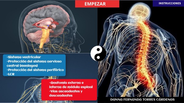 1. Pró VFE. Vías Ascendentes [Internet]. Disponible en: http://www.fmv-uba.org.ar/grado/medicina/ciclo_biomedico/primer_a%F1o/anatomia/catedra1/pdfs/vias-ascendentes.pdf 2. Leal F. Vías Medulares [Internet]. Disponible en: https://sites.google.com/site/felipelealmatamala/home/mi-cuaderno/vias-medulares?tmpl=/system/app/templates/print/&showPrintDialog=1 3. Alica Bajo Elhenna Rodríguez Lorena Rocha Iván Sandoval. Tractos ascendentes y descendentes [Internet]. YouTube; 2012. Disponible en: https://www.youtube.com/watch?v=Cyp_EgIEWN4 4. Tena-Suck ML. Líquido Cefalorraquídeo. Patología Revista Latinoamericana. 1 de octubre de 2018;56:281–7. 5. Pérez I, editor. Dinámica del líquido cefalorraquídeo y barrera hematoencefálica. Vol. 20. Instituto Nacional de Neurología y Neurocirugía; 2015. 6. Snell R. Neuroanatomía Clínica. 7a-CAP 4a ed. Lippincott Williams & Wilkins; 2013. 7. Duque J, editor. A historical approach to the ventricular system of the brain. Vol. 65. U. Caldas; 2016. 8. Ozen OA. SPINAL ANATOMY. En: Ozen OA, editor. Minimally Invasive Procedures In Spine Surgery. Intertip; 2015. p. 8. 9.Oliveira JT. The Peripheral Nervous System. En: Oliveira JT, editor. 2016. p. 33. 10. Frost BA. Materials for the Spine: Anatomy, Problems, and Solutions. 2019;4 11. Laboratorios Senosiain S.A. ATLAS NERVIOSO CENTRAL Y PERIFERICO [Internet]. Disponible en: http://www.senosiain.com.mx/assets/library/ATLAS_Nervioso_Central_y_Periferico.pdf 12. Rodriguez F. SISTEMA VENTRICULAR [Internet]. Asociación Educar; 2019. Disponible en: https://asociacioneducar.com/sistemaventricular 13. Moyano E. PUNCIÓN LUMBAR [Internet]. Disponible en: https://www.webconsultas.com/sites/default/files/styles/encabezado_articulo/public/migrated/puncion-lumbar.jpg 14. Pinimg.com. [citado el 20 de mayo de 2021]. Disponible en: https://i.pinimg.com/236x/35/3a/8f/353a8f932d6eff4b3d65997b33f1ec66--grave-m-in.jpg 15. Disponible en: https://i.pinimg.com/originals/88/05/96/880596ff33555518b9910565bba0dae6.gif 16. I0.wp.com. [citado el 20 de mayo de 2021]. Disponible en: https://i0.wp.com/misaquitomagico.es/wp-content/uploads/2014/10/hIPOTONIA.png?fit=579%2C343 17. Slidesharecdn.com. [citado el 20 de mayo de 2021]. Disponible en: https://image.slidesharecdn.com/irrigacionmedular-121022001126-phpapp01/95/irrigacin-de-la-mdula-espinal-7-638.jpg?cb=1371152502 18. vGiphy.com. [citado el 20 de mayo de 2021]. Disponible en: https://media1.giphy.com/media/cIfj6F7459CVOsrOlN/giphy.gif Pinimg.com. [citado el 20 de mayo de 2021]. Disponible en: https://i.pinimg.com/564x/76/5a/2b/765a2b88d614f5cbe4fdf4c74c554ee9.jpg 19. Giphy.com. [citado el 20 de mayo de 2021]. Disponible en: https://media1.giphy.com/media/cIfj6F7459CVOsrOlN/giphy.gif 20.Blogspot.com. [citado 20 de mayo de 2021]. Disponible en: https://3.bp.blogspot.com/-SngvbE3fDzg/Wctc4uvdxzI/AAAAAAAAhYU/RltATyGZhaAk1Rmriq_rSUomujeEJSryACLcBGAs/s1600/MANO.gif 21. Blogspot.com. [citado 20 de mayo de 2021]. Disponible en: https://2.bp.blogspot.com/-5McmCebaZys/VwwCWlyeh0I/AAAAAAAAARo/PgD62p-BjosKUTziCHwzFsvgSE6_qetLQ/s320/45v15n09-13129222fig01.jpg 22. Petitfisiotrain.com. [citado 20 de mayo de 2021]. Disponible en: http://petitfisiotrain.com/wp-content/uploads/2016/11/propiocepci%C3%B3n-rodilla-300x179.jpg 23. Eva_Starz. Qoobee Doubt GIF - Qoobee Doubt - Discover & Share GIFs. 2018 . Google.com. [citado 20 de mayo de 2021]. Disponible en: https://sites.google.com/site/inteligenciaemocionalrsll/_/rsrc/1427592073710/home/cerebro-emocional/neurotransmisores/9.jpeg?height=225&width=400 24. Ramírez B. Halotano: ¿Qué es y para qué sirve? [Internet]. Prixz.com. 2020 [citado 20 de mayo de 2021]. Disponible en: https://prixz.com/salud/halotano-que-es-y-para-que-sirve/