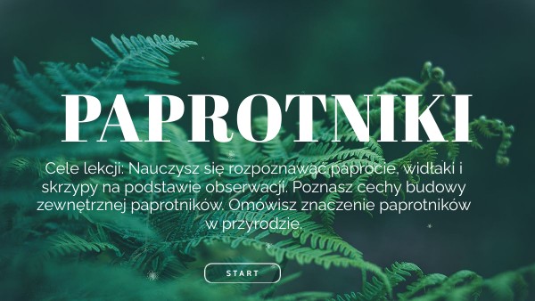 Cele lekcji: Nauczysz się rozpoznawać paprocie, widłaki i skrzypy na podstawie obserwacji. Poznasz cechy budowy zewnętrznej paprotników. Omówisz znaczenie paprotników w przyrodzie.