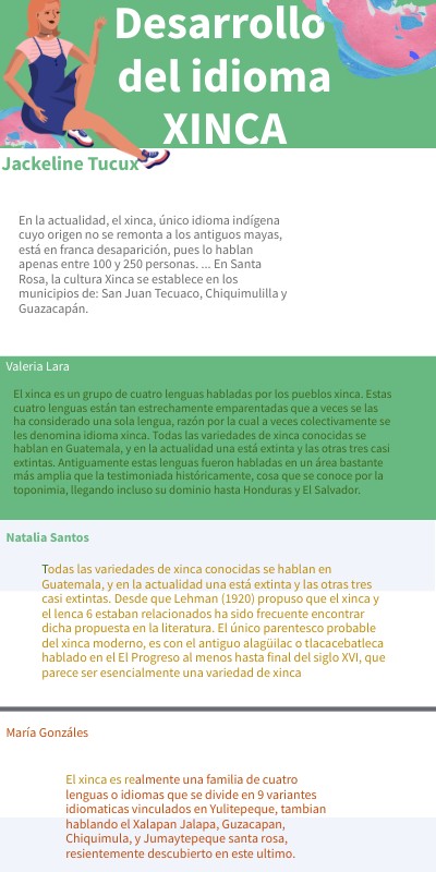 el desarrollo xinca en la actualidad ,el xinca, unico idioma indigena cuyo origen no remonta a los antiguos mayas, esta en francia desaparicion, pues lo hablan a pena entre 100 y250 personas en santa rosa, la cultura xinca se establece en los municipios de san juan , tecuaco, chiquilullia y guazcapan.