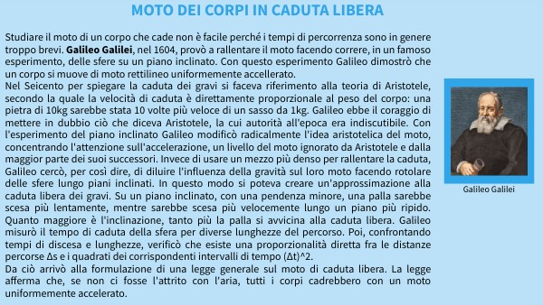 Studiare il moto di un corpo che cade non è facile perché i tempi di percorrenza sono in genere troppo brevi. Galileo Galilei, nel 1604, provò a rallentare il moto facendo correre, in un famoso esperimento, delle sfere su un piano inclinato. Con questo esperimento Galileo dimostrò che un corpo si muove di moto rettilineo uniformemente accellerato. Nel Seicento per spiegare la caduta dei gravi si faceva riferimento alla teoria di Aristotele, secondo la quale la velocità di caduta è direttamente proporzionale al peso del corpo: una pietra di 10kg sarebbe stata 10 volte più veloce di un sasso da 1kg. Galileo ebbe il coraggio di mettere in dubbio ciò che diceva Aristotele, la cui autorità all'epoca era indiscutibile. Con l'esperimento del piano inclinato Galileo modificò radicalmente l'idea aristotelica del moto, concentrando l'attenzione sull'accelerazione, un livello del moto ignorato da Aristotele e dalla maggior parte dei suoi successori. Invece di usare un mezzo più denso per rallentare la caduta, Galileo cercò, per così dire, di diluire l'influenza della gravità sul loro moto facendo rotolare delle sfere lungo piani inclinati. In questo modo si poteva creare un'approssimazione alla caduta libera dei gravi. Su un piano inclinato, con una pendenza minore, una palla sarebbe scesa più lentamente, mentre sarebbe scesa più velocemente lungo un piano più ripido. Quanto maggiore è l'inclinazione, tanto più la palla si avvicina alla caduta libera. Galileo misurò il tempo di caduta della sfera per diverse lunghezze del percorso. Poi, confrontando tempi di discesa e lunghezze, verificò che esiste una proporzionalità diretta fra le distanze percorse Δs e i quadrati dei corrispondenti intervalli di tempo (Δt)^2. Da ciò arrivò alla formulazione di una legge generale sul moto di caduta libera. La legge afferma che, se non ci fosse l'attrito con l'aria, tutti i corpi cadrebbero con un moto uniformemente accelerato.