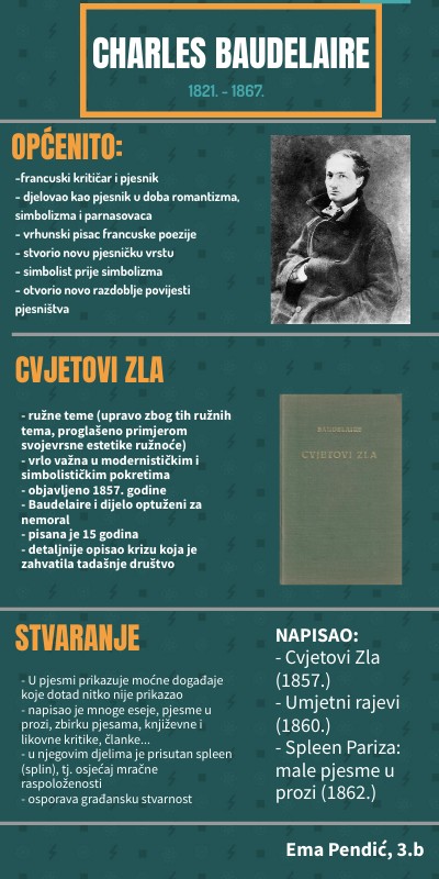 NAPISAO: - Cvjetovi Zla (1857.) - Umjetni rajevi (1860.) - Spleen Pariza: male pjesme u prozi (1862.)