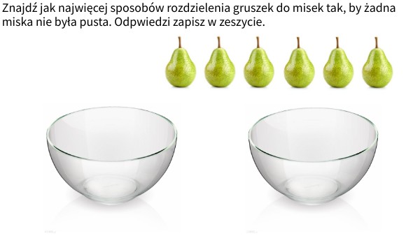 Znajdź jak najwięcej sposobów rozdzielenia gruszek do misek tak, by żadna miska nie była pusta. Odpwiedzi zapisz w zeszycie.