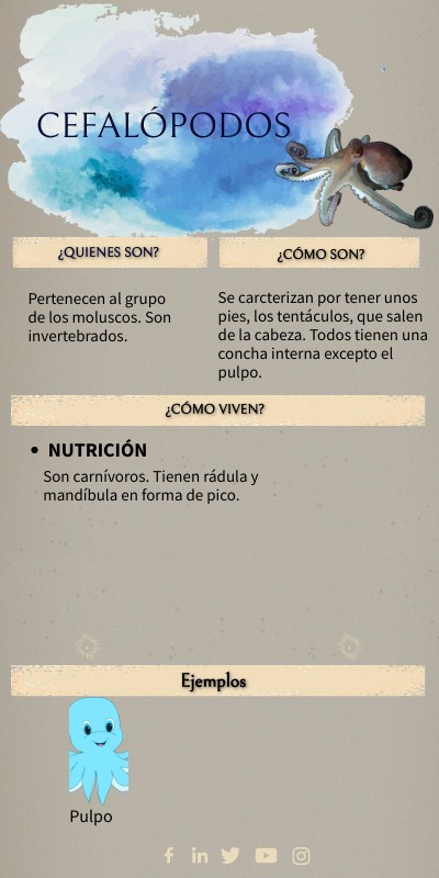 Se carcterizan por tener unos pies, los tentáculos, que salen de la cabeza. Todos tienen una concha interna excepto el pulpo.