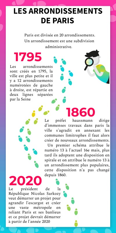 Le préfet haussmann dirige d'immenses travaux dans paris la ville s'agradit en annexant les communes limitrophes il faut alors créer de nouveaux arrondissements. Un premier schéma attribue le numéro 13 à l'actuel 16e mais, plus tard ils adoptent une disposition en spirale et on attribue le numéro 13 à un arrondissement plus populaires, cette disposition n'a pas changé depuis 1860.