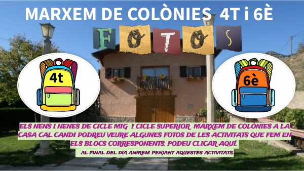ELS NENS I NENES DE CICLE MIG I CICLE SUPERIOR MARXEM DE COLÒNIES A LA CASA CAL CANDI PODREU VEURE ALGUNES FOTOS DE LES ACTIVITATS QUE FEM EN ELS BLOCS CORRESPONENTS. PODEU CLICAR AQUÍ. al final del dia anirem penjant aquestes activitats.
