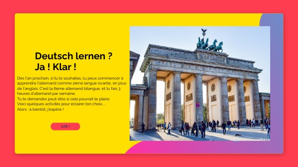 Dès l'an prochain, si tu le souhaites, tu peux commencer à apprendre l'allemand comme 2ème langue vivante, en plus de l'anglais. C'est la 6ème allemand bilangue, et tu fais 3 heures d'allemand par semaine. Tu te demandes peut-être si cela pourrait te plaire. Voici quelques activités pour éclairer ton choix.... Alors : à bientôt, j'espère !