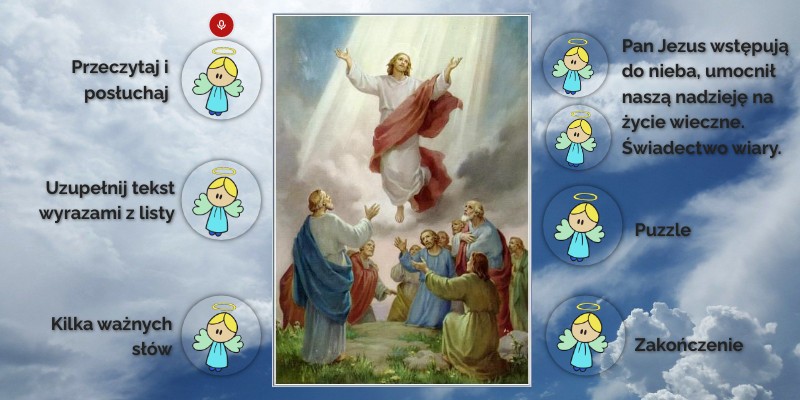 "Gdy Duch Święty zstąpi na was, otrzymacie Jego moc i będziecie moimi świadkami w Jerozolimie i w całej Judei, i w Samarii, i aż po krańce ziemi» Po tych słowach uniósł się w ich obecności w górę i obłok zabrał Go im sprzed oczu. Kiedy uporczywie wpatrywali się w Niego, jak wstępował do nieba, przystąpili do nich dwaj mężowie w białych szatach. I rzekli: «Mężowie z Galilei, dlaczego stoicie i wpatrujecie się w niebo? Ten Jezus, wzięty od was do nieba, przyjdzie tak samo, jak widzieliście Go wstępującego do nieba»".(Dz 1, 8-11)