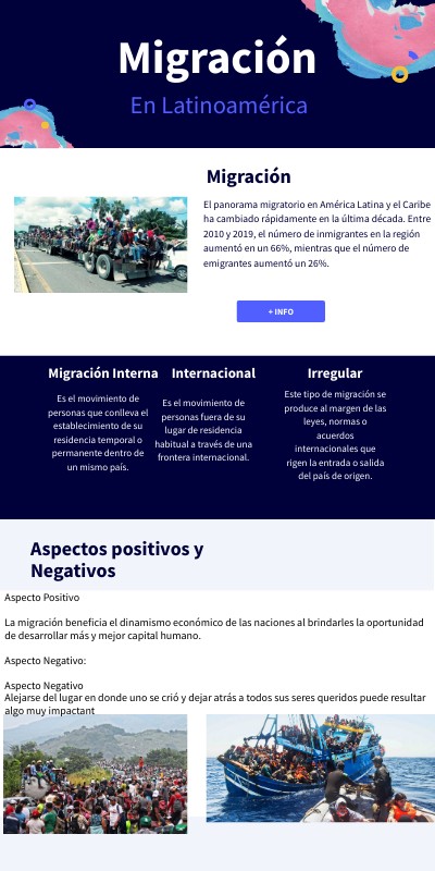 Aspecto PositivoLa migración beneficia el dinamismo económico de las naciones al brindarles la oportunidad de desarrollar más y mejor capital humano.Aspecto Negativo:Aspecto Negativo Alejarse del lugar en donde uno se crió y dejar atrás a todos sus seres queridos puede resultar algo muy impactant