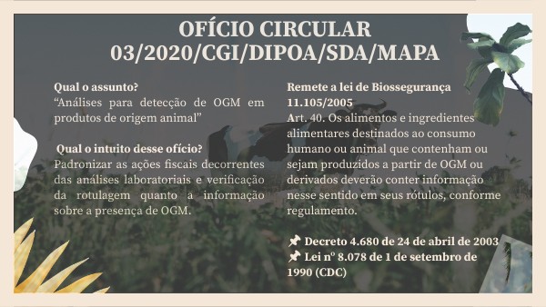 Qual o assunto? “Análises para detecção de OGM em produtos de origem animal” Qual o intuito desse ofício? Padronizar as ações fiscais decorrentes das análises laboratoriais e verificação da rotulagem quanto a informação sobre a presença de OGM.